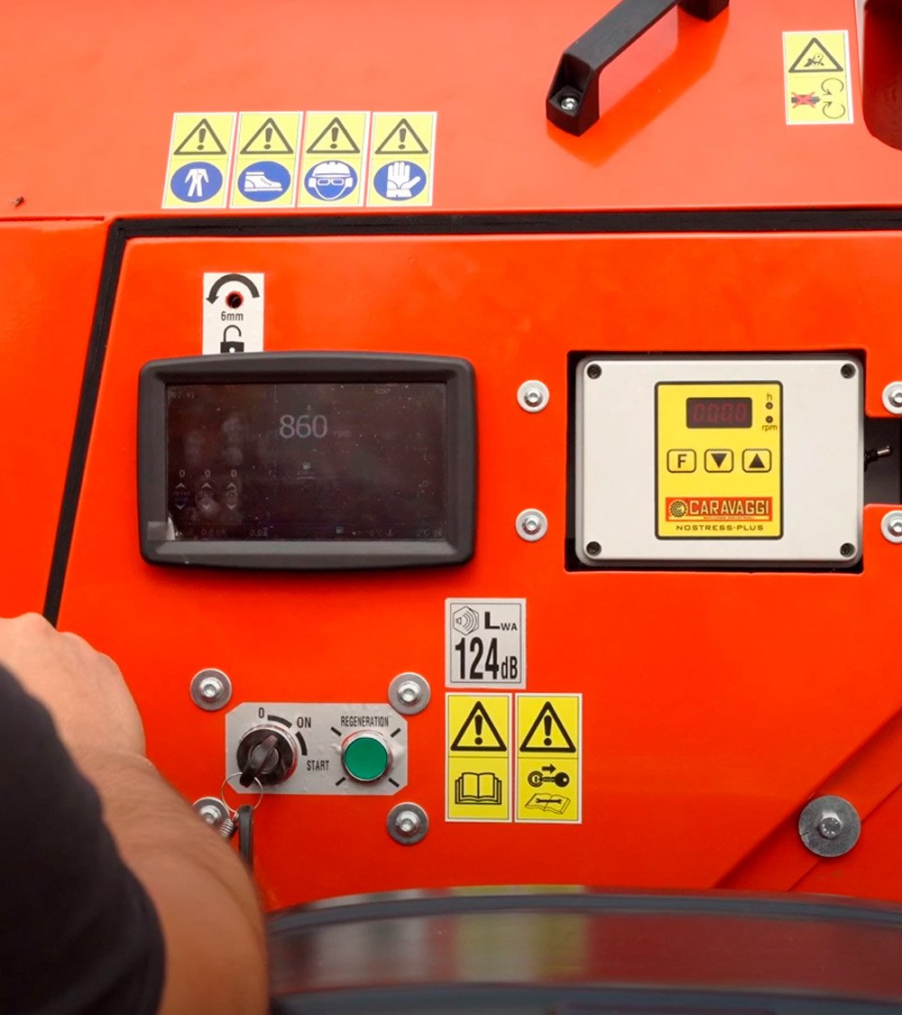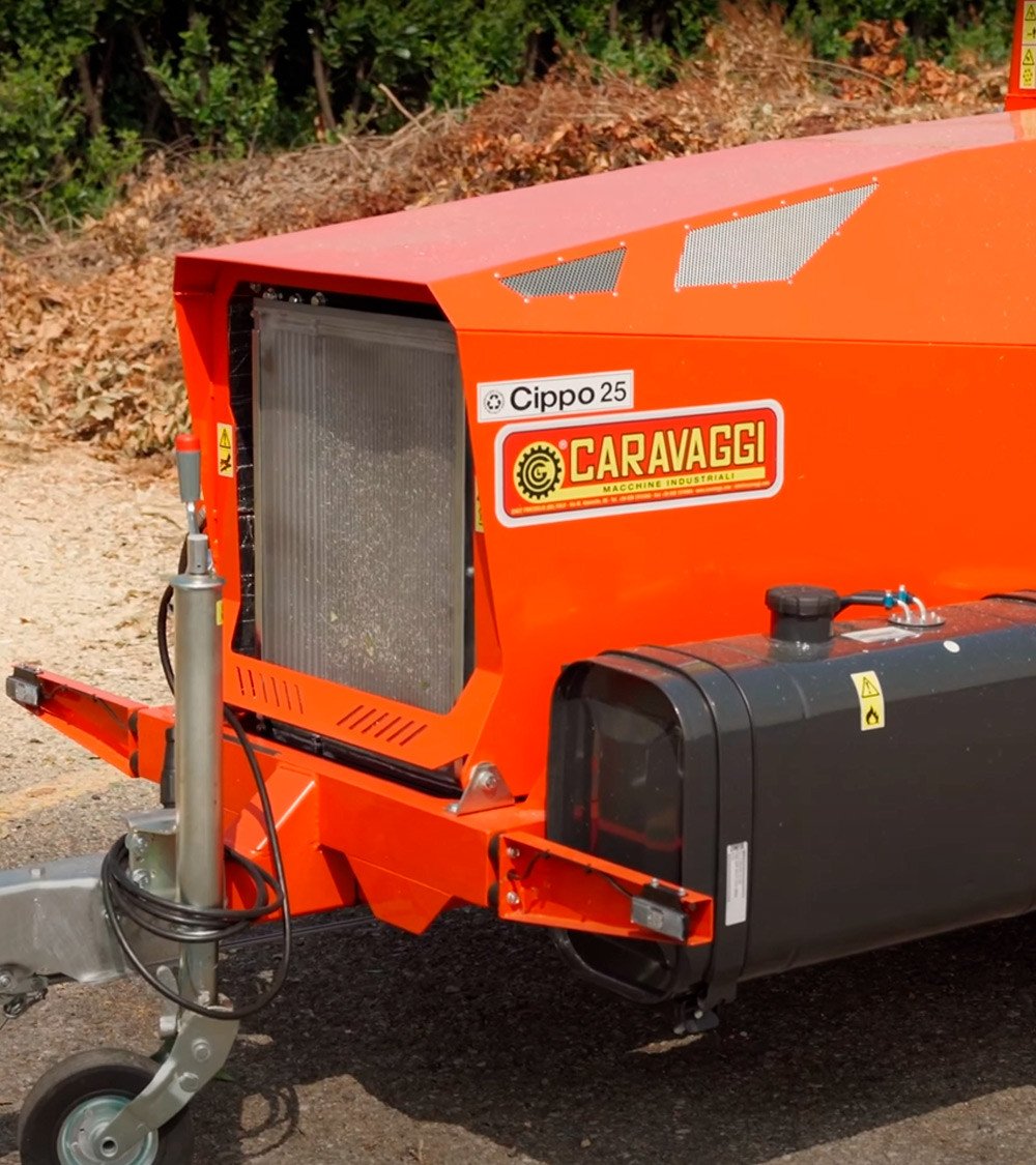La Caravaggi CIPPO 25T (motor diésel Iveco AIFO F32 — 75 HP) es una biotrituradora profesional de alto rendimiento, diseñada para servicios municipales, empresas de mantenimiento de zonas verdes y explotaciones forestales que requieren máximo rendimiento continuo.