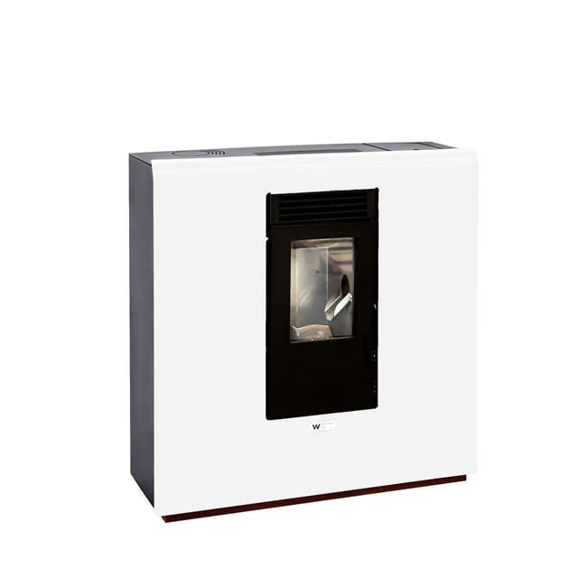 Estufa de pellets Watt Slim fabricada en España en acero con acabado en blanco y brasero de fundición. Tiene una potencia de 8,02 kW y una capacidad de tolva de 12 kg. Es para colocar sobre el suelo y es programable. Clase energética: A+. Dispone de la etiqueta Ecolabel, que certifica que es un producto respetuoso con la salud de las personas y el medioambiente (proporciona una muy buena calidad del aire interior: A+). Medidas: 100 x 100 cm (ancho x alto).