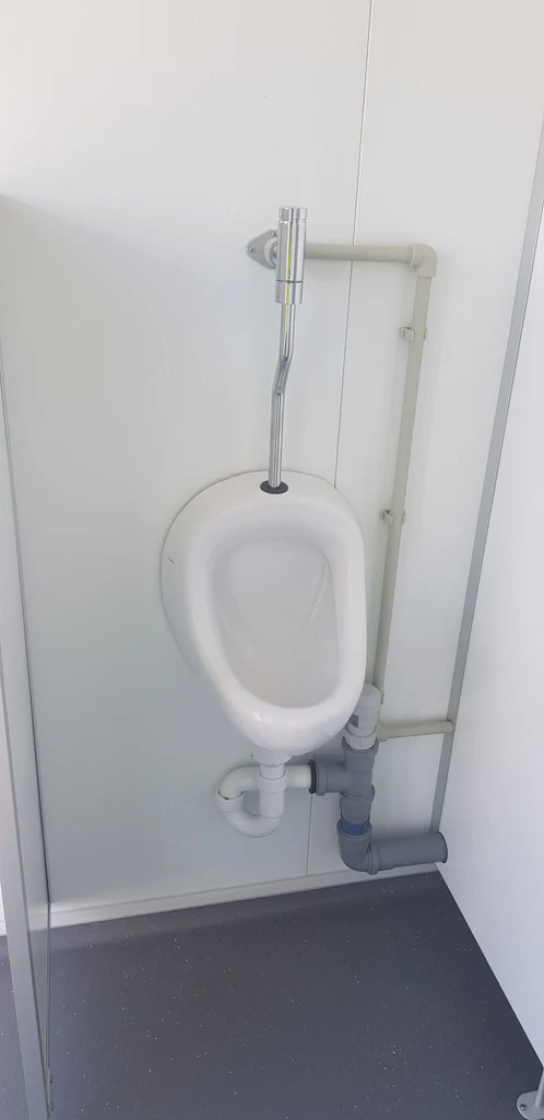 Versión: Edificio modular sanitario (WC-URINOIR-DOUCHE-LAVABOS) + Revestimiento de acero estilo madera clara garantizado 30 años.