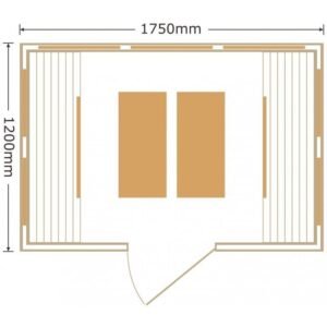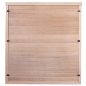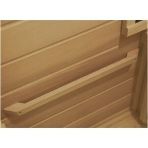 La sauna está hecha de abeto de madera maciza con una pared inferior de 43 mm de grosor (-6,5 + 30 + 6,5 mm) y lados de 31 mm (6,5 + 18 + 6,5 mm) . Para dar un toque más moderno, la parte delantera de la sauna está completamente acristalada.