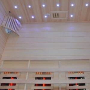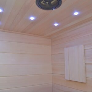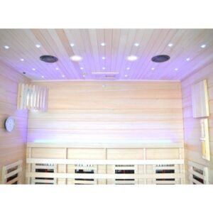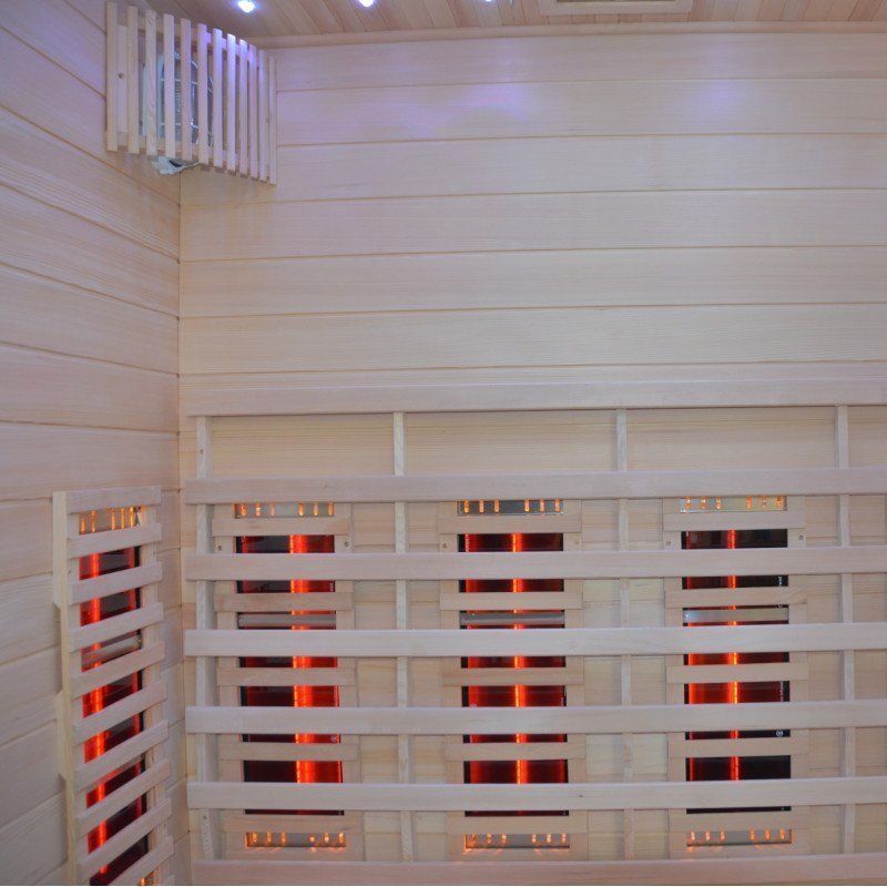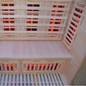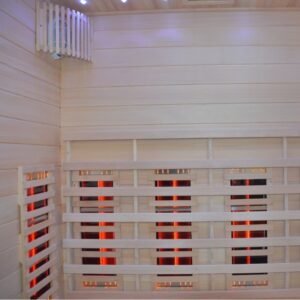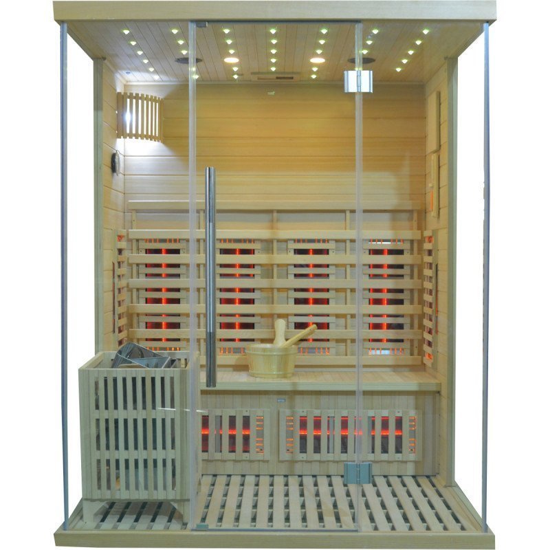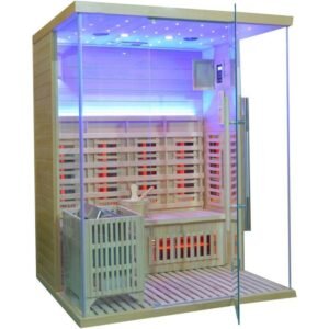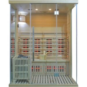 La cabina, equipada con una puerta y paredes de vidrio, ofrece una estética moderna y refinada que se integrará perfectamente en su espacio vital. En el interior, los bancos de madera invitan al descanso, mientras que la estufa SAWO de 6000W asegura un rápido aumento de temperatura para una sesión de sauna tradicional. Para aquellos que prefieren un calor más suave, los elementos infrarrojos de 2800W permiten una difusión de calor directa y beneficiosa.